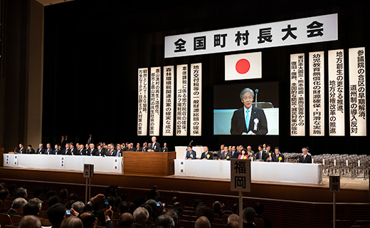 大会は岩田利雄副会長(千葉県東庄町長)の司会で進められ、はじめに荒木泰臣全国町村会長(熊本県嘉島町長)が挨拶に立ち、「町村を取り巻く環境は極めて厳しいものがある。町村長相互の連携を一層強固なものとし、直面する課題、将来にわたる困難な課題に一致結束して積極果敢に取り組んでいこう」と参加者に訴えました。