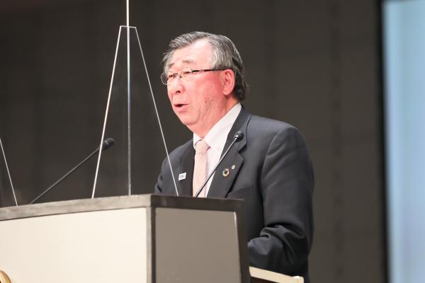 大会は棚野孝夫副会長・会長代行(北海道白糠町長)の司会で進められ、はじめに荒木泰臣全国町村会長(熊本県嘉島町長)が挨拶に立ち、「町村を取り巻く環境は極めて厳しいものがある。我々町村長が、相互の連携を一層強固なものとして、直面する課題、将来にわたる困難な課題に一致団結して積極果敢に取り組んでいこう」と参加者に訴えました。