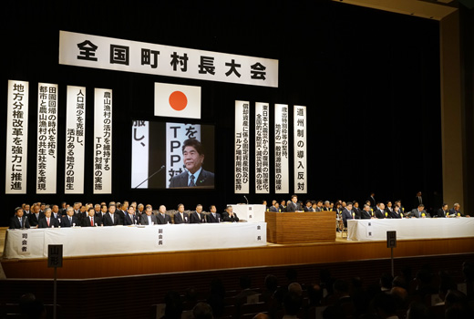 大会は棚野孝夫副会長(北海道白糠町長)の司会で進められ、はじめに藤原忠彦全国町村会長(長野県川上村長)が挨拶に立ち、「安倍内閣が進めている地方創生を日本創生につなげていけるよう、全力で取り組んでいく。また、大筋合意したTPP協定が、中山間地域の農業に深刻な打撃を与えるのではないかと懸念しており、最重要の問題として今後も対応していく。誇りある地域づくりのために、困難な課題に積極果敢に取り組んでいこう」と参加者に訴えました。