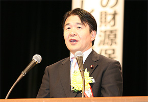 地方分権一括法の施行以来、自治体の合併が促進されまして町村の数は今日では1,400にまで減少したと報告を聞いております。そのような中で依然として、町としてあるいは村として地方自治の発展と住民の福祉向上のために不断の努力を続けておられるご出席の町村長の皆様に対して、まずは心から敬意を表します。