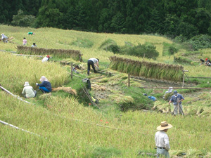 ※オーナー制度:10人を上限とし、1口3万円でオーナーになれる。田は約100平方mを割り振り、秋に収穫した米15㎏を保証している。また春と秋には地元産の野菜や加工品を送付。他に年に2~3回の機関紙を発行。田植の集い、稲刈りの集いにおいては参加をお願いしている。