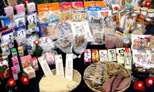 地場産品は数多くあります。アゴ(飛び魚)の出汁は有名ですが、粉末加工でパック入りの五島あごじまん、極細の麺とコシの強さで大人気の「五島手延べうどん」、島内全域に自生するヤブ椿の実を原料にした「椿油」、芋を原料とし古くから愛されてきた「カンコロ餅」、五島の美しい海水を原料とした「自然海塩」、様々な工夫を凝らした水産加工品等々が、新上五島町を代表する特産品として広く愛されています。