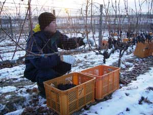 マイナス15℃の早朝、アイスワインの原料となる山幸を収穫