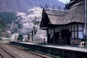 茅葺き屋根の駅舎湯上温泉駅