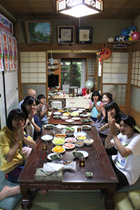 「いただきま~す」自分たちで収穫、調理した野菜が並ぶ食卓