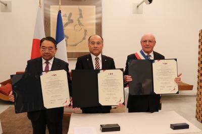 それからお互いの距離はさらに縮まり、姉妹都市締結に至るまでに時間は要しませんでした。外務省や総務省の後押しも受け、2017年11月、パリ市内の在フランス日本国大使公邸において姉妹都市協定締結の調印に至りました。