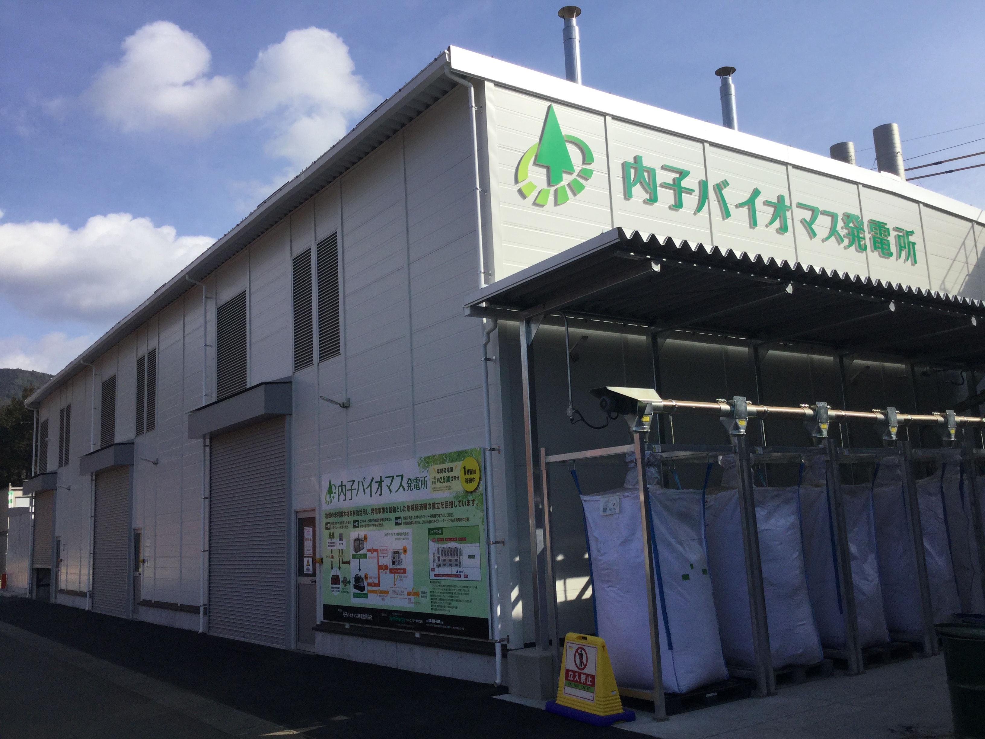 ▲町内の未利用間伐材をペレット燃料にして発電する内子バイオマス発電所