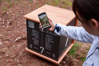 サインには、健康や自然環境に関する情報が表示されており、アプリと連動した情報の取捨選択によって、情報伝達をデザインし、利用する人たちの健康や自然環境に対する気付きを促す工夫をしています。具体的には、次のサインまでの距離(m)、歩数(歩)、時間(min)、勾配(%)、消費カロリー(Kcal)のほか、運動強度の指標としてメッツ(Mets: metabolic equivalents)、自然環境の指標として植生指数(NDVI: Normalized Difference Vegetation Index)を表示しています。高低差のあるルートは、トラックごとに傾斜や歩行面の状況が異なり、運動強度が異なります。また、自然環境の有無は、身体的活動の増加によるウェルビーイング(身体的、精神的、社会的に良好な状態)に結びつくメカニズムが明らかになっています。これらを組み合わせることで、さまざまな運動強度による身体活動を、さまざまな自然との距離感で楽しめるトラックをデザインしました。