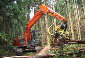 その状況を改善するためには、間伐作業がまず求められ、町はその作業から発生する間伐材をエネルギー資源に代えることで、経済循環を起こそうと、平成17年からNEDO(新エネルギー・産業技術総合開発機構)の実験事業に取り組みました。森林に光を投げかける間伐作業を効率的に行うため、高性能林業機械の導入はもとより、作業計画にGIS(地理情報システム)を用いることで、ルート設定からその数量の把握まで詳細に行うことができるようになりました。