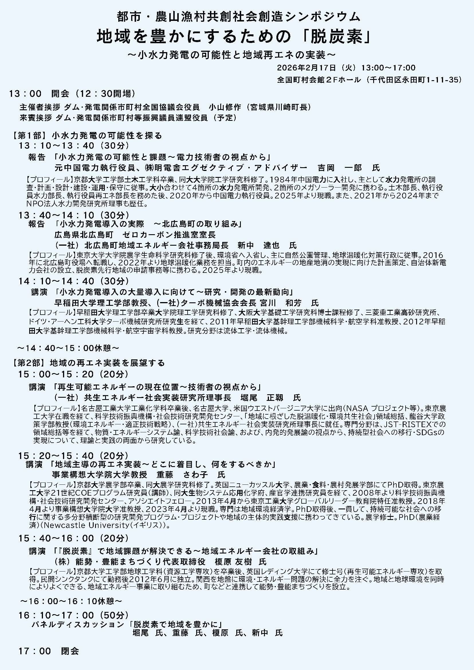 この度「都市・農山漁村共創社会創造シンポジウム」の一環として、ダム・発電関係市町村全国協議会と全国町村会との共催により、小水力発電と再生可能エネルギーの地域実装に向けた課題と展望等を探るべく、公開行事を開催いたします。